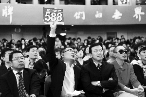 张着嘴举牌的是花钱最多的“美的集团”代表,戴墨镜者是史玉柱。本报记者 田丛 摄