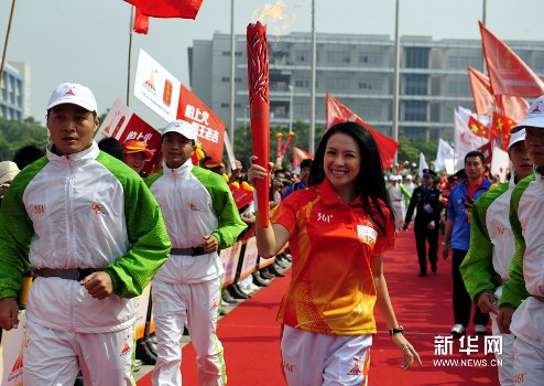 11月11日,第16届亚运圣火传递来到广州大学城。国际影星章子怡成为亚运火炬手,在大学城科学馆门前传递圣火,受到来自广州的十万多名90后大学生热捧。