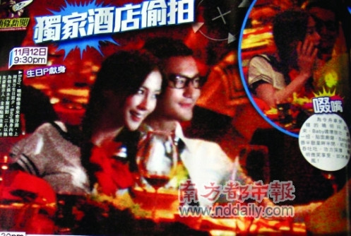 Baby当晚相约一班Model姐妹花身穿水手服在深圳某酒店包场,为黄晓明庆生,从派对现场图片可见两人十分亲密,除了有女方喂男方吃东西外,还有贴面亲吻、互相注视等“含情之举”。周刊报道指,当晚两人还一起入住了酒店高层蜜月套房。(朱燕霞)