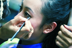 化妆是礼仪小姐必备的功课,有时需要两人前后协作才能完成。