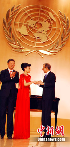联合国官员上台与谭晶握手 赞其歌声华丽与美妙兼备