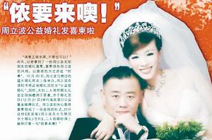 12月20日,周立波与胡洁的盛大婚礼将在上海举办。日前,记者拿到了一份周立波发给朋友的婚礼喜柬,该喜柬做成了一张报纸的形式《波波报(周立波先生与胡洁女士婚礼)号外》。在喜柬的包装信封上,大红的“囍”字下面写着一行“请着正装出席,不穿也可以!”在内页,头条位置上二人的感言有点煽情:“感谢命运的眷顾!我们终于成为了彼此的未来。感谢昨日的恩赐!我们终于明白了失去的意义。半世人生的等待,前世注定的姻缘!来吧,我的朋友!诚邀您见证这场意义非凡的公益型婚礼!”