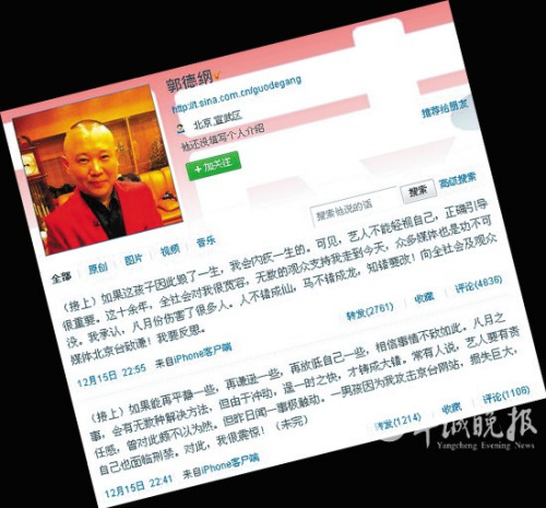前晚10时30分左右到11时,短短不到半小时内,郭德纲三次更新微博,就“徒弟打人事件”向北京电视台致歉,将闹出风波的原因归咎于自己的过于“膨胀”。