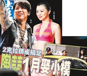 台湾媒体最近爆料,40岁的陶喆即将告别“钻石王老五”的称号,他的对象是小他16岁的嫩模简宝珊。交往数月后,陶喆即献上2克拉钻戒向女方求婚,婚期已定在明年1月。周刊还拍到简宝珊数次进出陶家、打扮得如贵妇的照片。不过陶喆的经纪人却说没听过陶喆明年要结婚。以周刊拍到的照片来看,交往是事实,但说结婚或许言之过早。