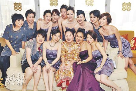 千嬅的一众姊妹都以圈外人为主,原来何超葭(后排左二)与千嬅私交甚笃,更破例做姊妹。(图片来源:香港明报)