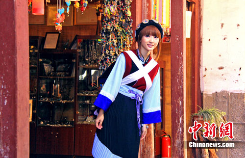 柳岩丽江红裙挽发 凸显古典韵味(组图)(3)