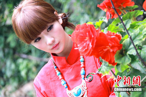 柳岩丽江红裙挽发 凸显古典韵味(组图)(5)