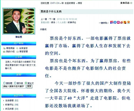 日前,《新闻联播》的主播郭志坚就在其博客上痛批《让子弹飞》脏话连篇,称“血腥场面和性暗示”把他折磨得只能提前离席。他表示,全片充斥脏话(国骂)、血腥场面和性暗示,“电影的吸引力也不是靠展示当众剖腹和把手放在女性敏感部位,更别说用山西话喊的下流语言,这些只能让观众感觉极不舒服。”