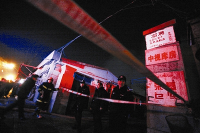 图为起火库房前,警方拉起了警戒线摄/记者 林晖