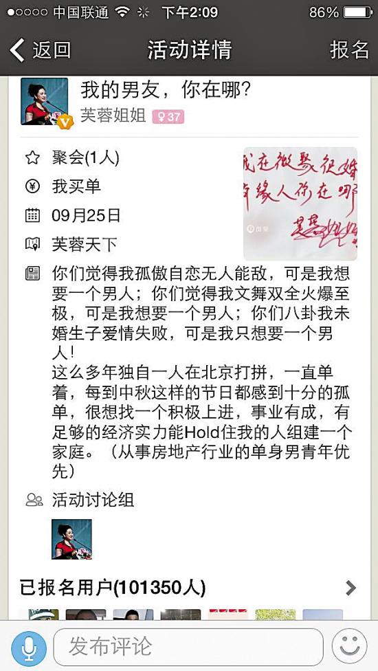 芙蓉姐姐中秋夜在移动社交平台上发布了一组婚纱写真照,现年38岁的她自称目前单身,要公开征婚组建家庭,“这么多年独自一人在北京打拼,一直单着,每到中秋这样的节日都感到十分的孤单,很想找一个积极上进,事业有成,有足够的经济实力能Hold住我的男人组建一个家庭,从事房地产行业的单身男士优先。”消息发出后数小时内便有超过10万人报名,芙蓉姐姐的“魅力”相当惊人!随后,芙蓉姐姐又在微博上@万达集团老板王健林的儿子王思聪,“我不要10万人的喜欢,我只要一个人的爱。谢谢‘微聚’上十万多追求我的男士,欢迎@王思聪这样优秀的男人报名。我在等你,你在哪?”