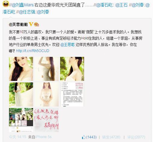虽然,芙蓉姐姐心仪的“国民老公”王思聪没有回应,但芙蓉姐姐的征婚信息却引来了任志强、潘石屹、余英等地产大佬和刘春、黎万强等互联网大佬的围观,先是刘春@任志强,任志强又@潘石屹,潘石屹则直接@王石。