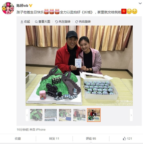 中新网4月2日电 今天是导演张艺谋65岁生日,晚间,妻子陈婷在微博晒出为张艺谋庆生照片,并留言“孩子他爸生日快乐,全力以赴拍好《长城》,家里就交给我啦”。