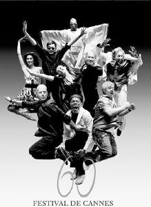 海报中的“跳跃”人物包括佩多罗.阿莫多瓦(前排右一)、萨缪尔.杰克逊(前排中)、布鲁斯.威利斯(前排左一);杰拉德.德帕迪约(二排右一)、简.坎萍(二排右二)、朱丽叶.比诺什(二排中)、王家卫(二排左二)、佩内洛普.克鲁兹(二排左一)和苏莱曼.西塞(上)。
