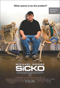 影片把保险公司和左右两翼政党的支持者们都描写成坏蛋,并且把美国的医疗系统和加拿大、法国、英国的医疗系统对比,称赞了后者由国家运行的医疗体系。在电影的高潮部分,那些参与9·11灾后救助的生病工人从美国去了古巴,在那里他们得到了更好和更便宜的救治。