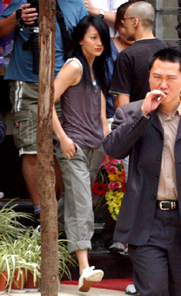 一群人熙熙攘攘,就是不见娇小的周迅,当记者担心瘦弱的她会被这群人潮淹没的时候,身穿黑色T恤的周迅猫着腰从边沿的台阶上一跳一跳地出现了,一眨眼,这个古灵精怪的女子就没影了。“埋伏”在车上的摄影记者赶紧举起相机狂拍,无奈,眼尖的不止记者,保安几个箭步冲上来就要抢相机,而会所老板则在一旁大声叫道,删掉,把里面的照片删掉。大概是听见外面的叫声,本来都已经进去的邓超又出现在门口,好奇地探头张望。在拉扯中,记者的相机被三四个保安抢了过去,随即剧组的摄影师也跑出来,帮忙“毁尸灭迹”,而会所老板在旁边悻悻地自言自语:“你的照片发出去,我的一万块钱就没了。”