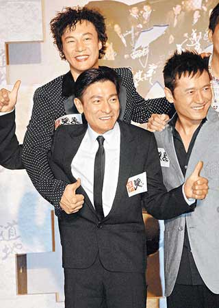 中新网10月18日电 刘德华(华仔)投资的新片《兄弟》前晚在香港首映,苗侨伟、黄日华等人到场力挺。众人朗诵《诗经》诗句“兄弟阋于墙,外御其侮”,刚念完华仔身后广告牌应声倒下,让他十分尴尬。日前香港地道乌龙茶饮料被发现注入消毒水,身为代言人的他在现场豪饮乌龙茶,力撑支持他多年的广告商。