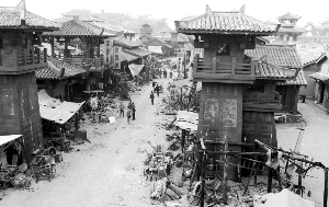 新造出来的一条街已经被《木乃伊3》折腾得满目疮痍,到处都是断壁残垣,满地烂瓦以及火烧过的痕迹,两边的店铺和房子都已经半倒塌,满地的战争遗迹几乎达到了让人难以插脚的地步,最为壮观的是街道尽头的城门楼子,正面已经全部被箭矢所覆盖,满地都是攻城用的圆木,还有两辆攻城战车也竖立其中。城墙上,一名老外剧组人员正在加固攻城的云梯,城楼上摆满了点火用的丙烷桶。