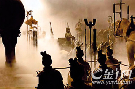 片花放毕,记者们马上“找茬”。银幕上一闪而过地出现了地动仪,秦陵里的兵马俑与战车混杂在一起,兵俑手头都有兵器。但地动仪由东汉张衡发明,秦陵里的兵马俑和战车是完全分开罗列的,兵俑都空手无兵器。