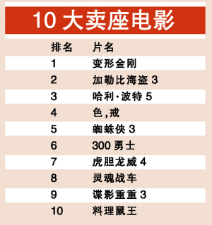 今年台湾地区电影市场卖相强劲,是好莱坞续集片当道,但包括《加勒比海盗3》、《哈利·波特5》、《蜘蛛人3》、《虎胆龙威4》、《谍影重重3》都是续集片。还好有《色,戒》为华语片争光,挤进10大。该片在美国被列为NC-17级,票房虽然仅430万美元(约3170万人民币,下同),但在香港票房近5000万元,台北市票房约3400万元,台湾地区约6500万元,缔造李安个人最高票房纪录。