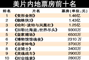 美国大片的票房收益在中国内地市场2007年继续增长,20部分账大片总票房收益合计达到11.7亿人民币。《变形金刚》以2.77亿元占头把交椅,《蜘蛛侠3》居第二。而包括《美食总动员》在内在世界其他市场上取得好成绩的动画片,中国票房则不佳。
