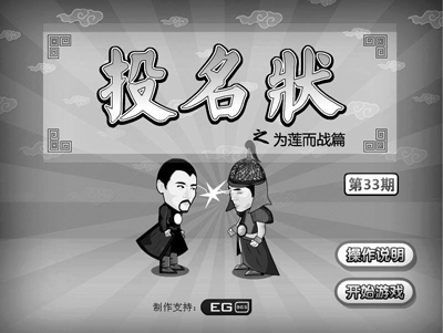 而互动恶搞《投名状》的游戏也很有趣,就是赵二虎发现自己夫人莲生和庞青云有染,为了挽回男人的尊严,他只有靠武力来证明自己是最强的,请参与游戏者帮赵二虎来挑战庞青云。而游戏规则就是使用控制键,控制赵二虎挑战庞青云,在规定时间内打败庞青云即告胜利。在熟悉了游戏规则之后,此类恶搞并无难度系数。胜者王败者寇,如果输了,赵二虎会惭愧跪地说:“为什么我会输?我才是元配。”而庞青云则会搂着莲生说:“我是唯一的选择,请支持壹基金。”结果令人忍俊不禁。