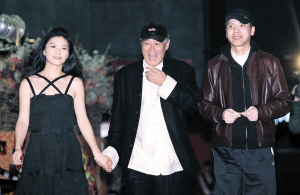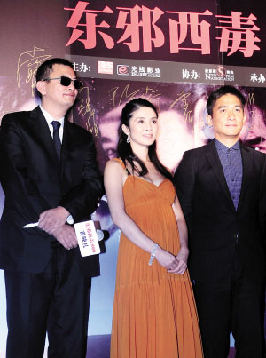 今天正式上映的《东邪西毒终极版》昨晚在西单大悦城首都影院举行了首映式。除了王家卫、梁朝伟、杨采妮等主创外,冯小刚和赵本山等诸多嘉宾也前来捧场。让人感到意外的是,头一天还与王家卫等人一同跟媒体见面的刘嘉玲昨天并没有出现在现场。此外,昨晚现场几乎成了怀念张国荣的专场,众多“荣迷”聚集在红地毯两旁,举着张国荣的画像喊着他的名字。几乎每一位嘉宾都表示,自己此番主要是为了在大银幕上看张国荣来的。只有冯小刚和赵本山沉默地走完红地毯,签名之后匆匆入场,没有发表任何看法。记者 杨莲洁 邹红/摄