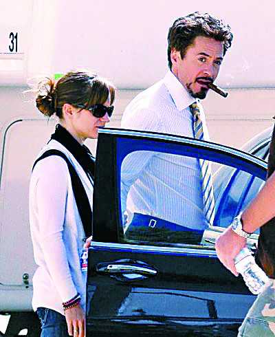 4月7日,洛杉矶,好莱坞大片《钢铁侠2》开拍第一天。继续由乔恩费儒执导,主演仍是第一部中的小罗伯特唐尼和格温妮丝帕特洛。小罗伯特叼着雪茄(上图),一副大佬派头,格温妮丝则装扮朴素,头发随意胡乱扎着。金球奖影帝米基洛克也将在该片中出演反派角色,有望饰演一位与钢铁侠较量的俄罗斯军火商。斯嘉丽约翰逊已确定出演“黑寡妇”一角。