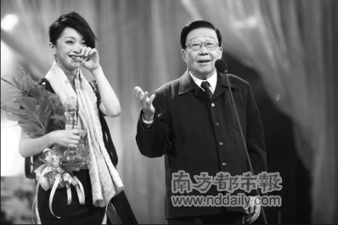 2008年度影视颁奖盛典7日晚揭晓,周迅的恩师谢铁骊导演亲自为她颁奖,让周迅不禁激动落泪:“没有谢导就没有今天的我。”(见上图)当宣布邀请谢铁骊导演登台颁奖时,原本在台上的周迅立即冲下去,走到观众席亲自搀扶谢导走上舞台。18年前周迅在银幕处女作《古墓荒斋》,正是出自谢铁骊导演之手。此番再次会面,让两人都是感慨不已。