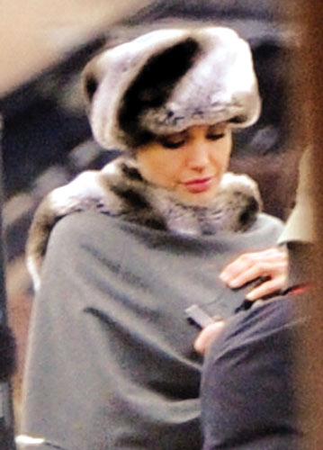 昨日,因拍摄新片《特工盐》而晕倒的安吉丽娜·朱莉重返拍摄现场。朱莉看上去相当虚弱,上身裹在一件皮草披风之中,头戴一顶帽子。