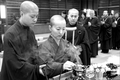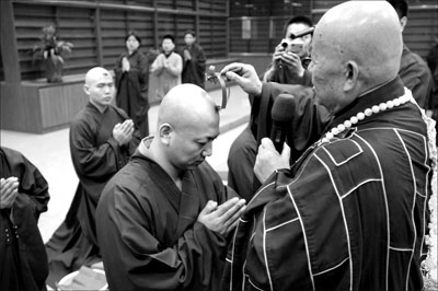 郝彤今年3月6日抵达深圳,3月8日上午8点37分剃度出家。王德源正在现场,用相机记录下了全程。在照片上,陈晓旭站在后排的僧人中间,没有别样,只是旁边有僧人帮她拿着拐杖。而对王德源来说,郝彤的出家,让他和友人感慨万千,并称其为“本时代最彻底的伟大爱情”。追悼会上,郝彤没有出现,只有署名为“同修释开诚”的花圈静静伫立。王德源说:“其中‘同修’二字,包容了何等壮阔博大的深情!”
