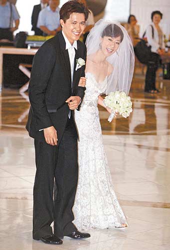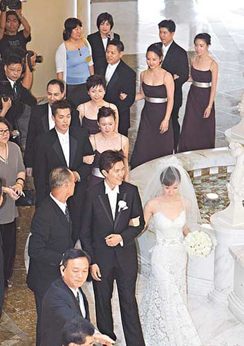 两人受美式教育,不顾“四”的数字忌讳,安排4对伴郎伴娘,但如果加上一对新人,倒也符合十全十美的组合。最受瞩目的伴郎是新郎弟弟曹斯行,高大帅气,相当抢镜,4位伴娘则都穿深咖啡色礼服。