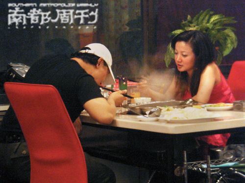 上周末一天晚上,一位圈内朋友突然给记者打来电话,说在亚运村一家火锅店看到谢东。记者驱车赶到,走进店里就看见大厅里一个偏僻角落有一男一女正在用餐。那位男士戴着一顶白色棒球帽,穿着一件黑色的T恤,身材略显肥胖,记者一下子认出他就是谢东,坐在他对面的那位女士30岁出头,留着披肩长发,穿着一件鲜艳的红色低胸上衣,五官小巧玲珑,气质文雅。也许怕别人认出自己,谢东总是低着头,但话语不断,谈兴很浓;而那位美女更多的时候是静静倾听,偶尔说几句话,脸上不时露出体贴安慰的表情,像在宽慰谢东。