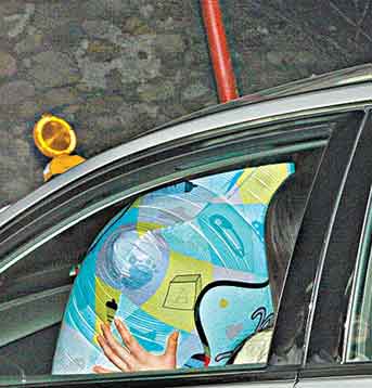 徐子淇上车后拿氢气球,遮面又遮肚。