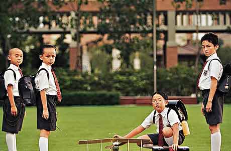 饰演星爷孩子同学的三名小演员(左一至左三),单看造型已各具特色。