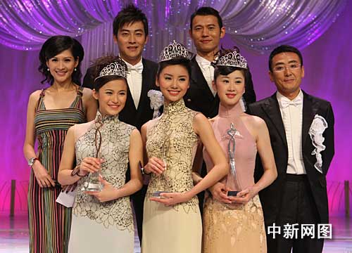 "中华小姐"三甲与司仪合影。