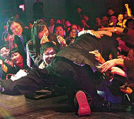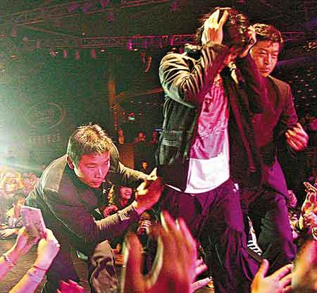但歌迷仍未心息,保安于是与歌迷展开一场拔河赛,力宏就是那条“绳索”,几经拉扯之后,保安才成功将力宏拉回台上,他一脸惊慌地用手掩头,不过专业的力宏惊魂未定便继续献唱,但明显已小心地跟观众席保持距离,后来走近与歌迷击掌也小心翼翼,表演完毕即由两名保安簇拥离场。