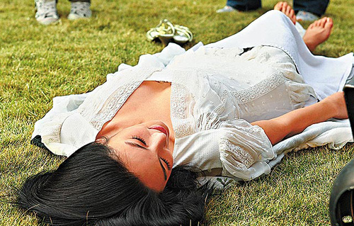 张雨绮躺在草地上时不慎春光乍泄,同时被跳蚤搞到苦不堪言。