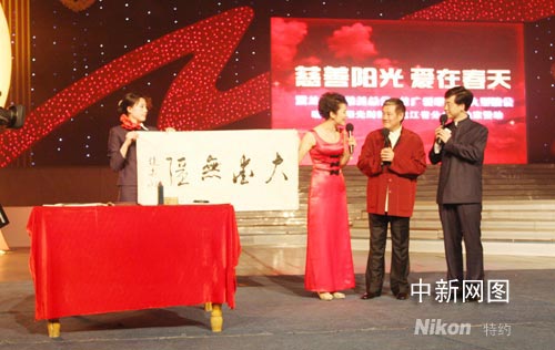 在现场,赵本山挥毫泼墨,书写下“大爱无疆”四个饱含浓情的字,现场企业喊出20万的竞拍价格,他以“本山式的幽默”回答大家:你们的爱心比我的书法更重,我的画值不了那么多钱,回头再给你们补两幅。(作者 刘建)