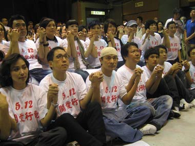 中新网5月16日电 中国四川省汶川县遭遇特大地震灾害,震动波及半个亚洲,数以万计民众罹难,灾情牵动神州大地, 牵动全世界关注的目光。香港演艺人协会、香港无线电视、亚洲电视、香港电台、凤凰卫视、新城电台六间机构共同组织“一方有难,八方支持”行动,香港媒体及演艺界人士积极响应,15日深夜,两百多位歌、影、视艺人及媒体从业人员齐聚香港电台,参与大合唱录音,为四川地震灾民祈福、加油、打气。