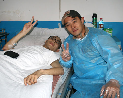失去双腿的这名男青年,名叫刘畅,是一个刚刚毕业的大学生。发生地震的那一瞬间,他用自己的身体护住了一位女同事。直到救援人员把他们俩救出来的时候,发现刘畅的双腿已经腐烂不成样子了,而他的同事只受了一点轻伤。医生说:“刘畅的生存意志很强,能活下来真的是一个奇迹,虽然他的面容依然清瘦,但是在被他救出来的女同事的悉心照顾下,身体康复很快。”当媒体采访刘畅是什么让他有这么坚强活下来的意志的的时候,他说:“我想看到同事平安!”一句简单的话,却又多么震撼人心。