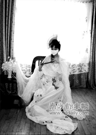 行头:蚊帐一匹,床单一副,扇子一个。以飘逸的白色表现古典服装行云流水、婉约浪漫的情怀……
