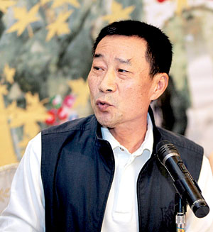 图为李雪健在记者见面会上阐述自己的角色