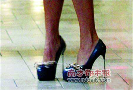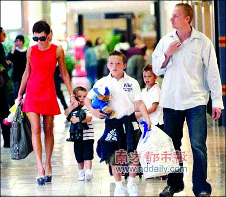 贝克汉姆陪同维多利亚在纽约的Macy商场出席旗下香水新品发布会,维多利亚穿着的黑色长靴就像裤子一样长,不过最令人惊奇的是它根本就没有“鞋跟”,走起路来完全是靠着前脚掌支撑,后脚跟完全是悬在半空中的,因此老公贝克汉姆全程“护驾”爱妻,惟恐维多利亚不慎摔倒。