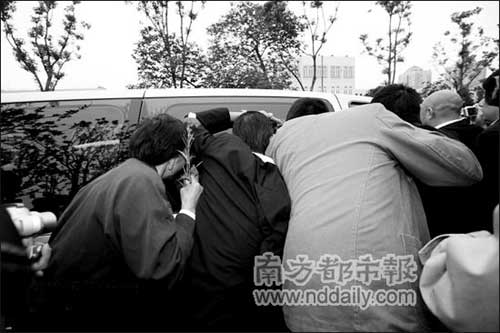 来为恩师送行的范冰冰、赵薇就没有那么幸运。据说,两人原本打算从正门进入,却接到提前到达的电影局副局长江平的电话,安排两人改从地下停车场或者侧门进入。等范冰冰到了侧门,发现人比正门还多,只好又绕到正门进入。有记者撰文称:“范冰冰先是被人群冲散,不得已而走了正门,冲过重重人群进入大厅,她的脸被挤得几乎变形,表情也极度痛苦。经纪人和司机为了保护她,差点和围观的拍照者打了起来,范冰冰见状忙大叫,‘不要打了!’”
