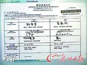 据悉,嘉欣、晋亨二人已于10月28日在婚姻注册处办理登记注册结婚的手续。晋亨在职业栏填上行政董事,嘉欣则填写艺人;在婚姻状况一栏上,亨亨填上离婚,而嘉欣填上未婚。
