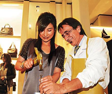 郭晶晶身穿丝绸红裙出席活动 现场学钉鞋(图)
