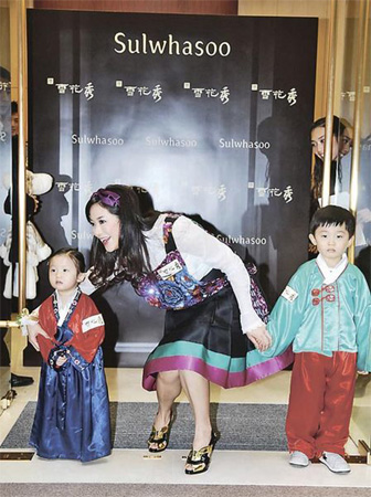 怀有3个多月身孕的子淇照穿高跟鞋,又屈身亲近小孩,似乎忘记孕妇的传统禁忌。香港《明报》图