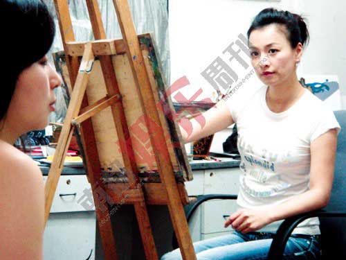很快张庭就成为上师大美院的正式研究生,她那一届只有她一个学生,专业是装饰设计,不过素描油画是必修课。她常常一个人在画室里画人体模特,无人打扰,司机接送,满身名牌,真的是这个学校里最高端的学生了。张庭每周三四天会定时练画,8个小时不间断,“表演是一种艺术,它兼具理性和感性,我觉得美术跟表演是相通的。”