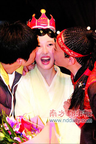 两位“宝哥哥”同时向“林妹妹”献吻。