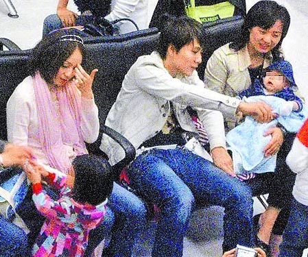 王仁甫(中)机场逗着哭闹的儿子YaYa(右前),季芹(左)与女儿乐乐(左前)则陪在一旁。